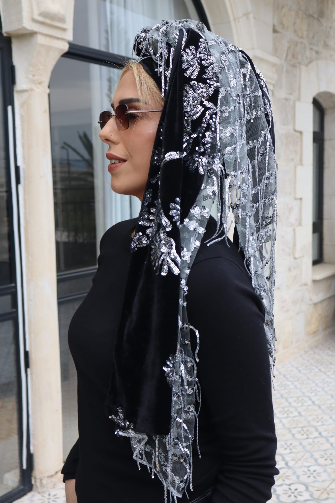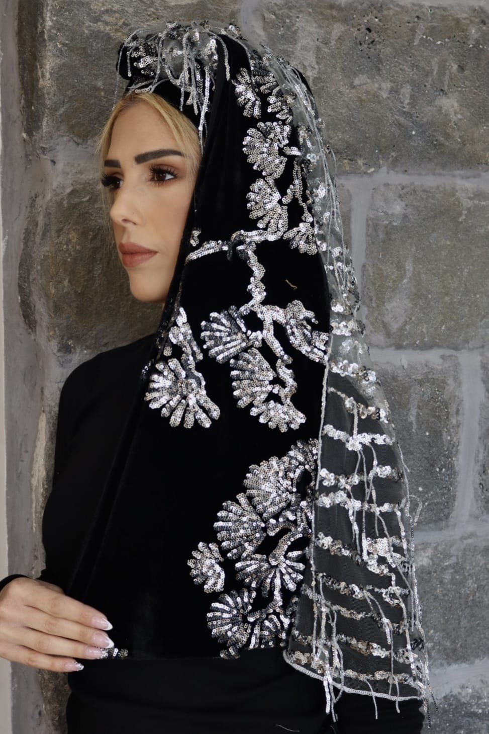 מטפחת לונג יוקרתית מבד קטיפה שחור עשיר, בשילוב עיטורי כסף עדינים שמוסיפים ברק אלגנטי ומראה חגיגי.