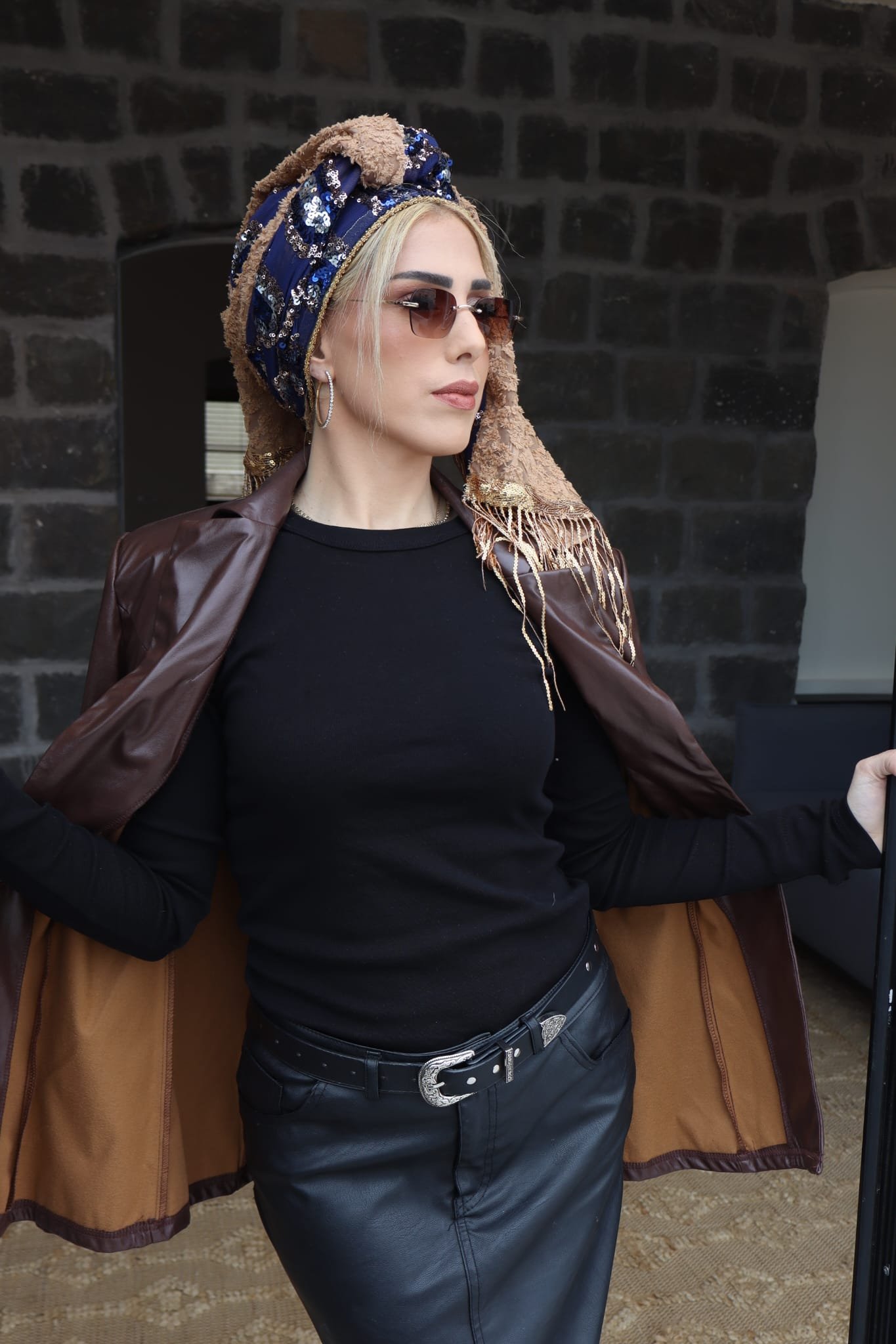 מטפחת לונג דגם הלני ייחודית בגווני חום וכחול בשילוב שני בדים יוקרתיים