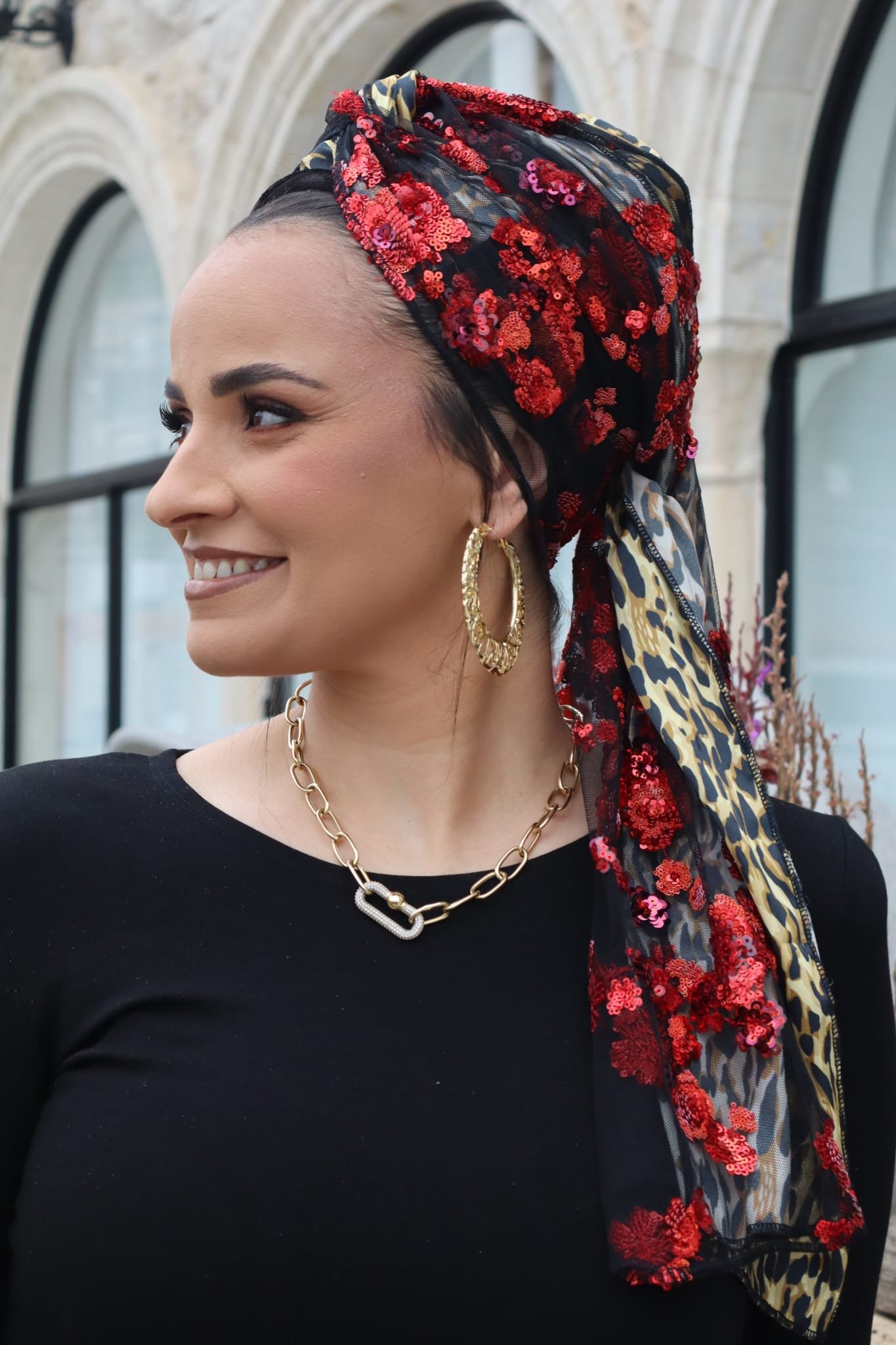 מטפחת לונג רות משלובת פייטים אדומים ומנומר בעיצוב דרמטי אלגנטי בתפירה מיוחדת משילוב שני בדים – בד חלק ובד פרחוני עם פייטים עדינים שמוסיפים ברק ייחודי.